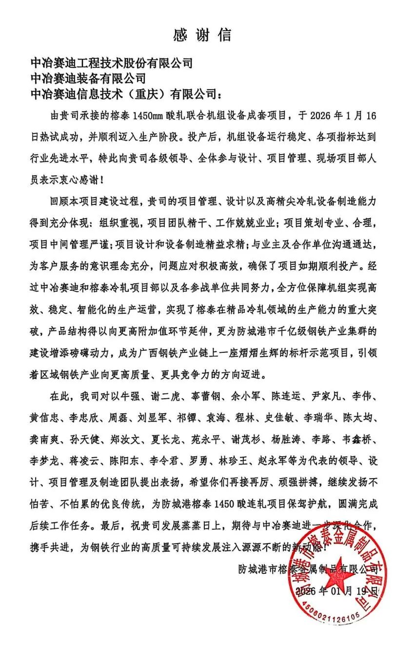 2026年1月19日,中冶賽迪收到來自廣西防城港金屬制品有限公司的感謝信,對中冶賽迪在榕泰1450mm酸軋聯(lián)合機組設備成套項目中的卓越表現(xiàn)給予充分肯定,對項目團隊的專業(yè)素養(yǎng)與敬業(yè)精神致以高度贊譽,字里行間滿含認可與信賴。